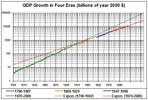 - Had the economy continued to grow after 1907 at the 1790-1907 rate, real GDP in 2006 would have been $32 trillion, vice the actual value of $11 trillion.