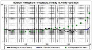 I begin with Steve McIntyre’s post about the “spaghetti graph,” which purports to show various estimates of changes in the temperature of the Northern Hemisphere since about 900 A.D. In fact, only three of the twelve series plotted in the “spaghetti graph” go back as far a 900 A.D.. And only one of those — the Moberg series — goes back as far as 1 A.D. Here, I splice NASA’s estimates of Northern Hemisphere temperatures to the Moberg series and compare the result to the world’s population (a proxy for “human activity”):