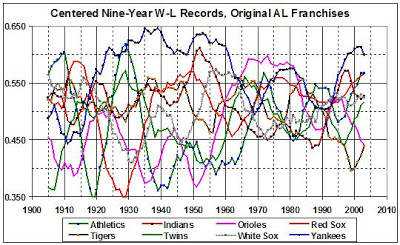 This is my first follow-up to “Has Baseball Become More Competitive?” Here I draw on the first two graphs from that post to make some observations about the best and worst teams in the history of the American League. My metric is the centered, nine-year won-lost (W-L) record (see “…Competitive?” for more about the metric). For reasons given here and here, I eschew performance in post-season play as a measure of excellence.