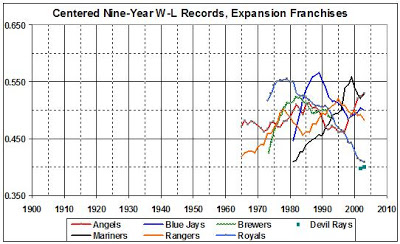Remember, I am measuring performance over nine-year spans — not individual seasons — so the following lists will not always correspond with lists of teams having the best and worst W-L record, by season. Using the nine-year, I present the best (E = expansion team)…