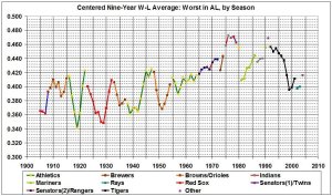 As for the doormats, here are the records of the worst American League teams over the years, as measured by centered, nine-year won-lost average (to enlarge, right-click and select “open link in new tab”):