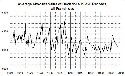 Finally, I have postulated elsewhere (“Has Baseball Become More ‘Competitive’?“) that baseball has become increasingly competitive since the advent of expansion in the 1960s and free agency in the 1970s. I have revised that assessment, in view of the above graphs. In particular, it seems that the gap between best and worst teams had been narrowing (generally, though not monotonically) since the earliest days of the American League until about 1980. That observation caused me to take another look at the third graph in “Has Baseball Become More ‘Competitive’?”: