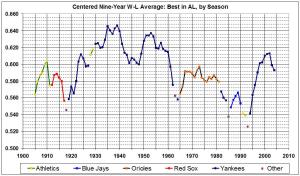 Here are the records of the best American League teams over the years, as measured by centered, nine-year won-lost average (to enlarge, right-click and select “open link in new tab”):
