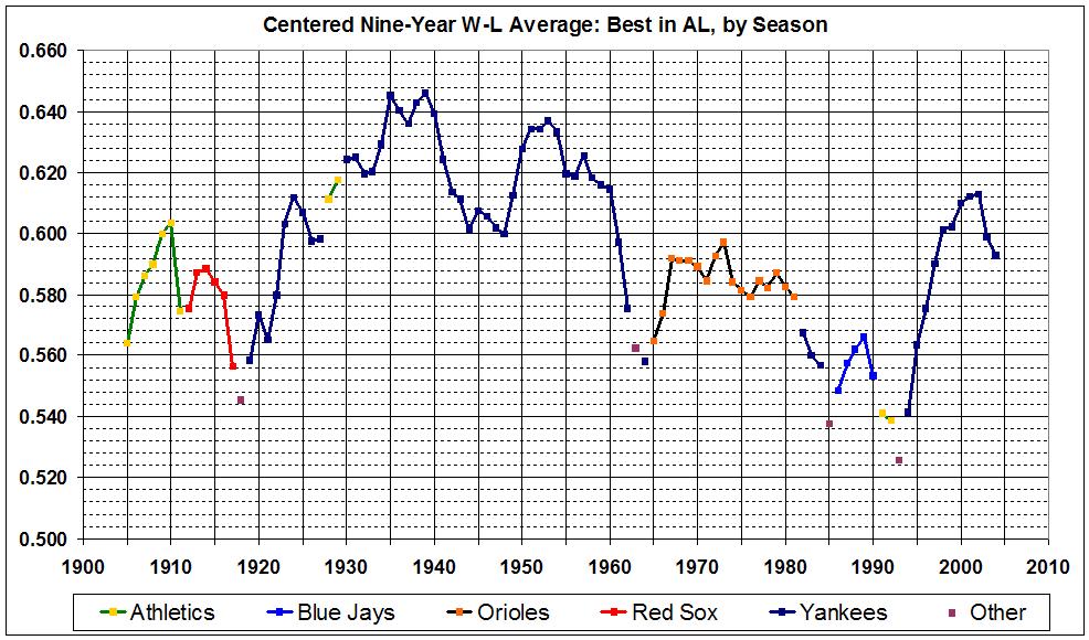 Here are the records of the best American League teams over the years, as measured by centered, nine-year won-lost average (to enlarge, right-click and select “open link in new tab”):