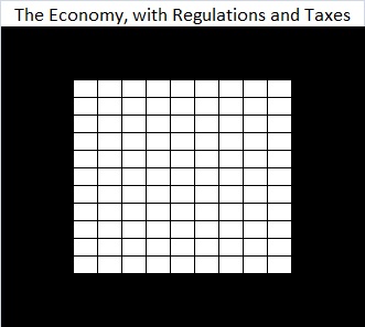 Taxes shrink the output of economic units by reducing incentives to produce, and by diverting resources to nonproductive, and counterproductive governmental uses. Regulations effectively eliminate many of the units that would otherwise exist and whose products would enable the expansion of all units: