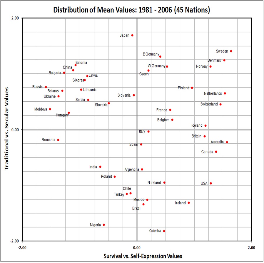 Figure 1 shows the locations of 52 countries on these two dimensions, using the data from the 2005–2007 WVS…. Relative scores on these two dimensions have been stable attributes of most countries throughout the period from 1981 to 2007.