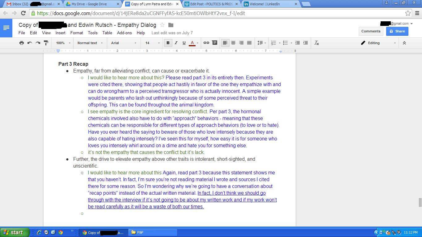 During the time that Rutsch and I communicated on the Google+ document, I urged him to read my posts and indicated that I’d cancel the interview if he didn’t demonstrate having read and understood the contents of my writing. Rutsch never did, so this became the basis for canceling the interview. In the image below, Rutsch’s words appear in green while mine appear in blue.
