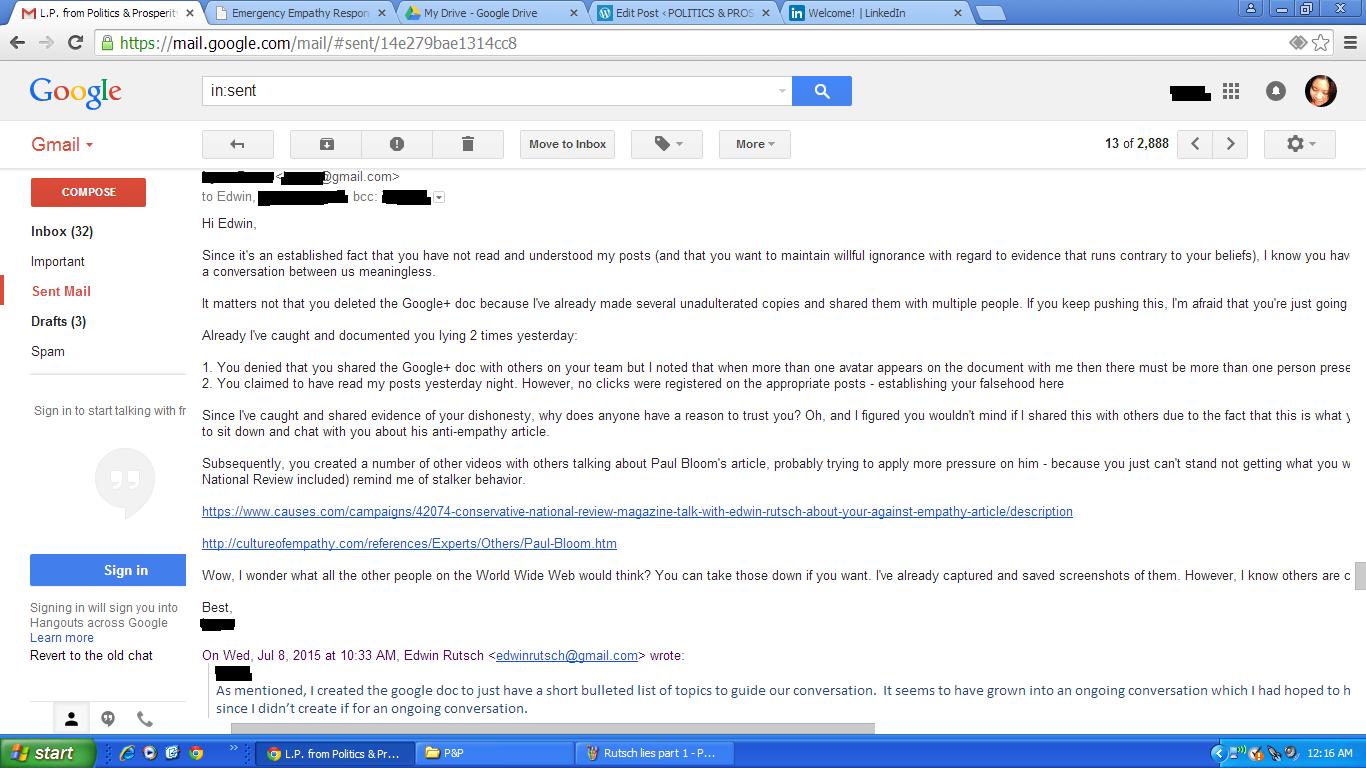 Despite the hard tone of my narration of events, I don’t take pleasure in singling out and publicly criticizing an individual. However, I hope that speaking out may help some of his 30,000+ followers to see Rutsch for what he actually is. Perhaps there’s also a sliver of hope that Rutsch will learn how moronic it is to engage in knee-jerk pursuits and attempts to wear down authors of articles he didn’t read and understand in an effort to censor negative evaluations of empathy.