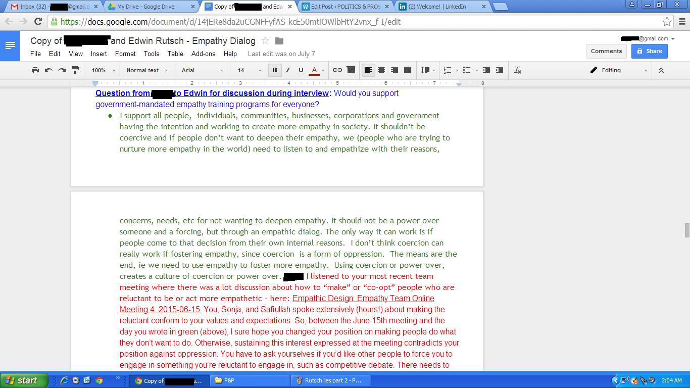 We’re already having a recorded dialog about my empathy articles. Welcome to my writing show!!! Everything you’ve said here and the Google+ doc will go out to the public on the world wide web… including your resistance to learning, your resistance to new information, your unwillingness to read, your lack of integrity, and your futile attempts at controlling this conversation with me via empathic dialogue.