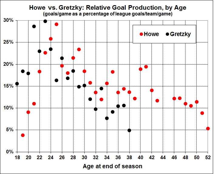 Gretzky got off to a faster start than Howe, but Howe had the better record from age 24 onward. Gretzky played 20 NHL seasons, the first ending when he was 19 years old and the last ending when he was 38 years old. Over the comparable 20-season span, Howe scored 4.3 percent more adjusted goals than did Gretzky. Moreover, Howe’s adjusted-goal total for his entire NHL-WHA career (32 seasons) exceeds Gretzky’s (21 seasons) by 43 percent. Howe not only lasted longer, but his decline was more gradual than Gretzky’s.