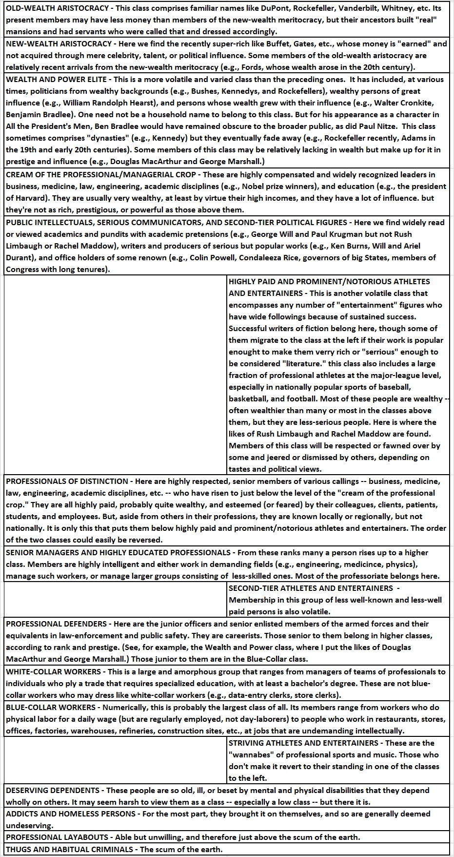 I am a beholder, and what I behold is parsed in the table below. There I have sorted Americans into broad, fuzzy, and overlapping classes, in roughly descending order of prestige. The indented entries pertain to a certain “type” of person who doesn’t fit neatly into the usual taxonomy of class. What is the type? You’ll see as you read the table.