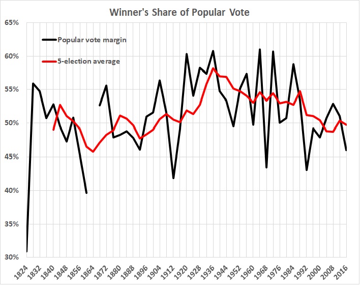 Popular votes were first recorded in the election of 1824. Here is a graphical history of the winning candidate’s percentages of the vote in each election from 1824 through 2016 (with the exclusion of 1864, when the South wasn’t in the Union):