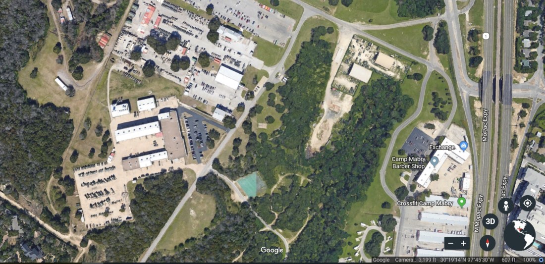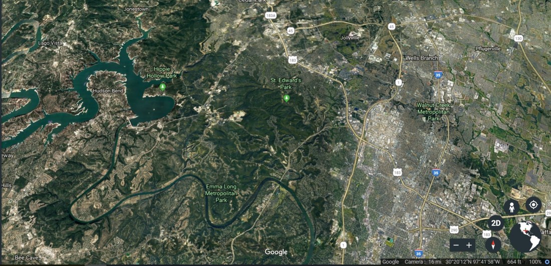 The contrast is obvious in the next photo. Camp Mabry is at the “1” (for Texas Loop 1) near the lower edge of the image. Topographically, it belongs with the flat part of Austin that lies mostly east of Loop 1. It is unrepresentative of the huge chunk of Austin and environs that lies to its north and west.