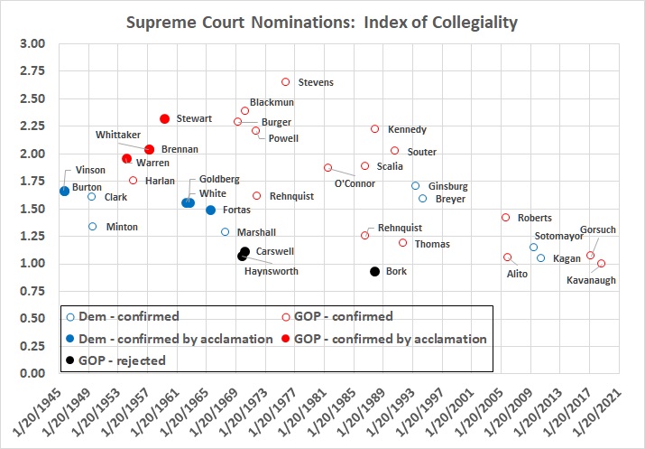 Nine nominees were approved by acclamation, that is, by a unanimous voice vote. In such cases, the value of the numerator in C is 1. But C varies, even in cases of acclamation, because of variations in the fraction of seats held by the party of the nominating president. In any event, the last confirmation by acclamation was in 1965 — an ill omen for collegiality.
