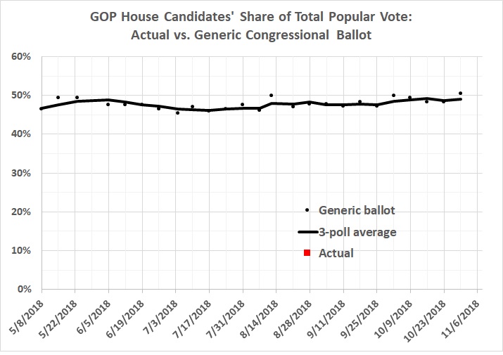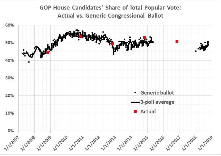 Let’s say, for the sake of argument, that this year’s polls are spot-on. The latest poll (figure 7) gives the GOP 51 percent of the two-party vote. How does that translate into House seats? Recent history is probably the best guide: