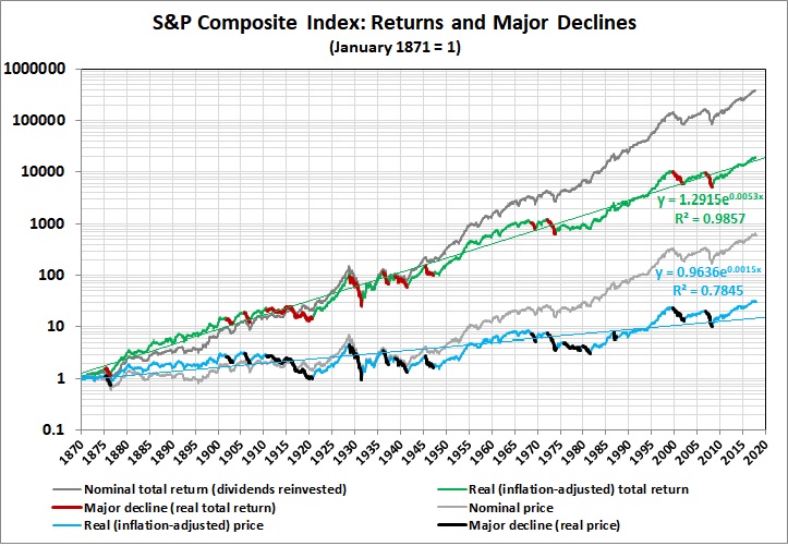 In the following notes, price refers to the value of the index; real price is the inflation-adjusted value of the index; total return is the value with dividends reinvested; real total return is the inflation-adjusted value of total return.