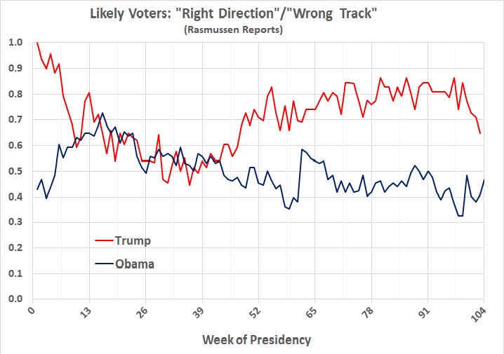 Every week since the first inauguration of Obama, Rasmussen Reports has asked 2,500 likely voters whether they see the country as going in the “right direction” or being on the “wrong track”. The graph below shows the ratios of “right direction”/”wrong track” for Trump and Obama: