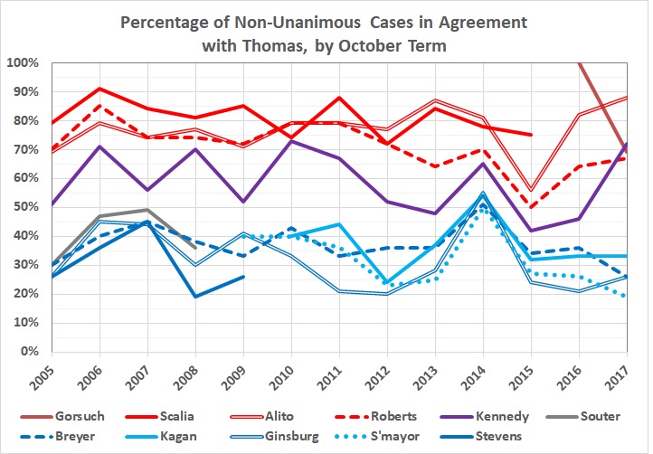 The “trend” for Gorsuch would be worrying, except for its brevity. The truly worrying trend is Chief Justice Roberts’s greater inclination to part ways with Thomas since the 2011 term. I am not comforted by the current (2018) term’s first divided opinion. Thomas wrote for a 5-4 majority and Roberts was in the minority with Kagan, Ginsburg, and Sotomayor.