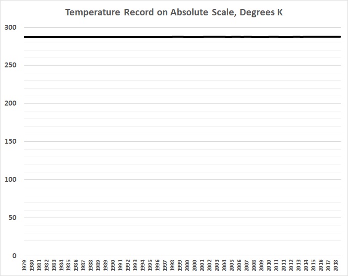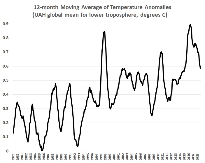The following graph is a plot of the 12-month moving average of “global” mean temperature anomalies for 1979-2018 in the lower troposphere, as reported by the climate-research unit of the University of Alabama-Huntsville (UAH):