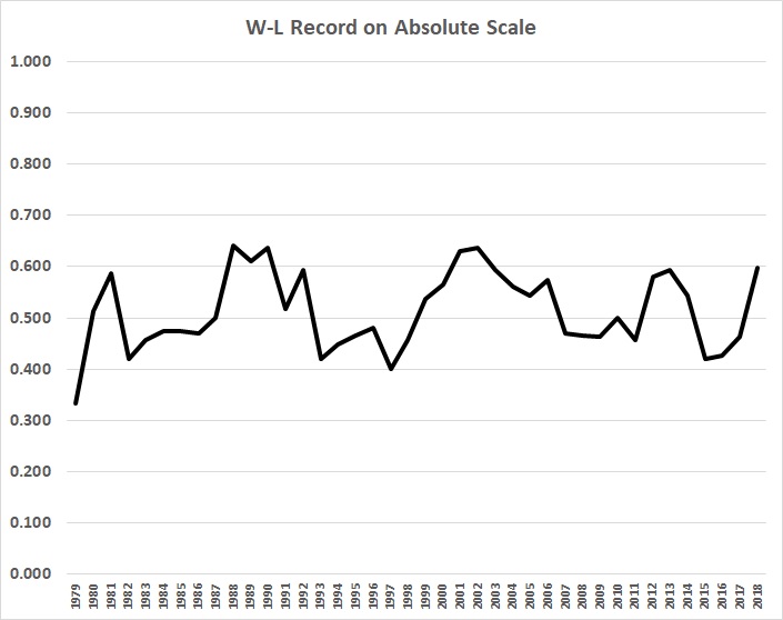 There’s a much better chance of predicting the success or failure of the Oakland A’s, whose record looks like this on an absolute scale: