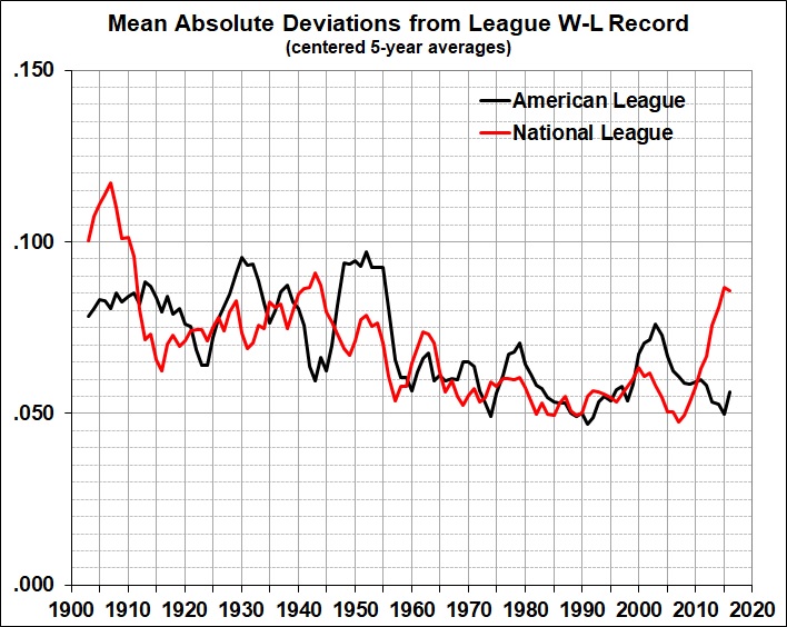 If the team’s record is .600 and the league’s record is .500 (as it always was until the onset of interleague play in 1997), then Dt = .100. And if a team’s record is .400 and the league’s record is .500, then Dt = -.100. Given that wins and losses cancel each other, the mean deviation for all teams in a league would be zero, or very near zero, which wouldn’t tell us much about the spread around the league average. So I use the absolute values of Dt and average them. In the case of teams with deviations of .100 and -.100, the absolute values of the deviations would be .100 and .100, yielding a mean of .100. In a more closely contested season, the deviations for the two teams might be .050 and -.050, yielding a mean absolute deviation of .050.