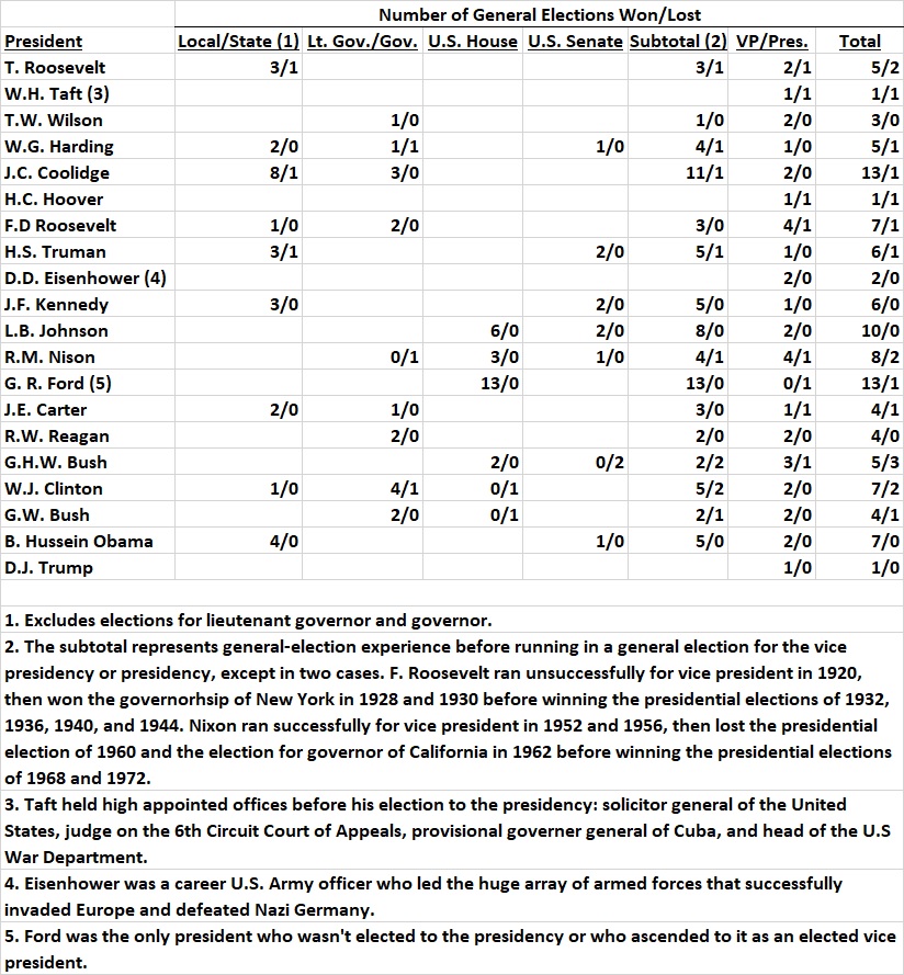The modern presidency began with the adored “activist”, Teddy Roosevelt. From TR to the present, there have been only four (of twenty) presidents who first competed in a general election as a candidate for the presidency: Taft, Hoover, Eisenhower, and Trump. Trump is alone in having had no previous governmental service before becoming president. There’s no moral to this story. Make of it what you will.