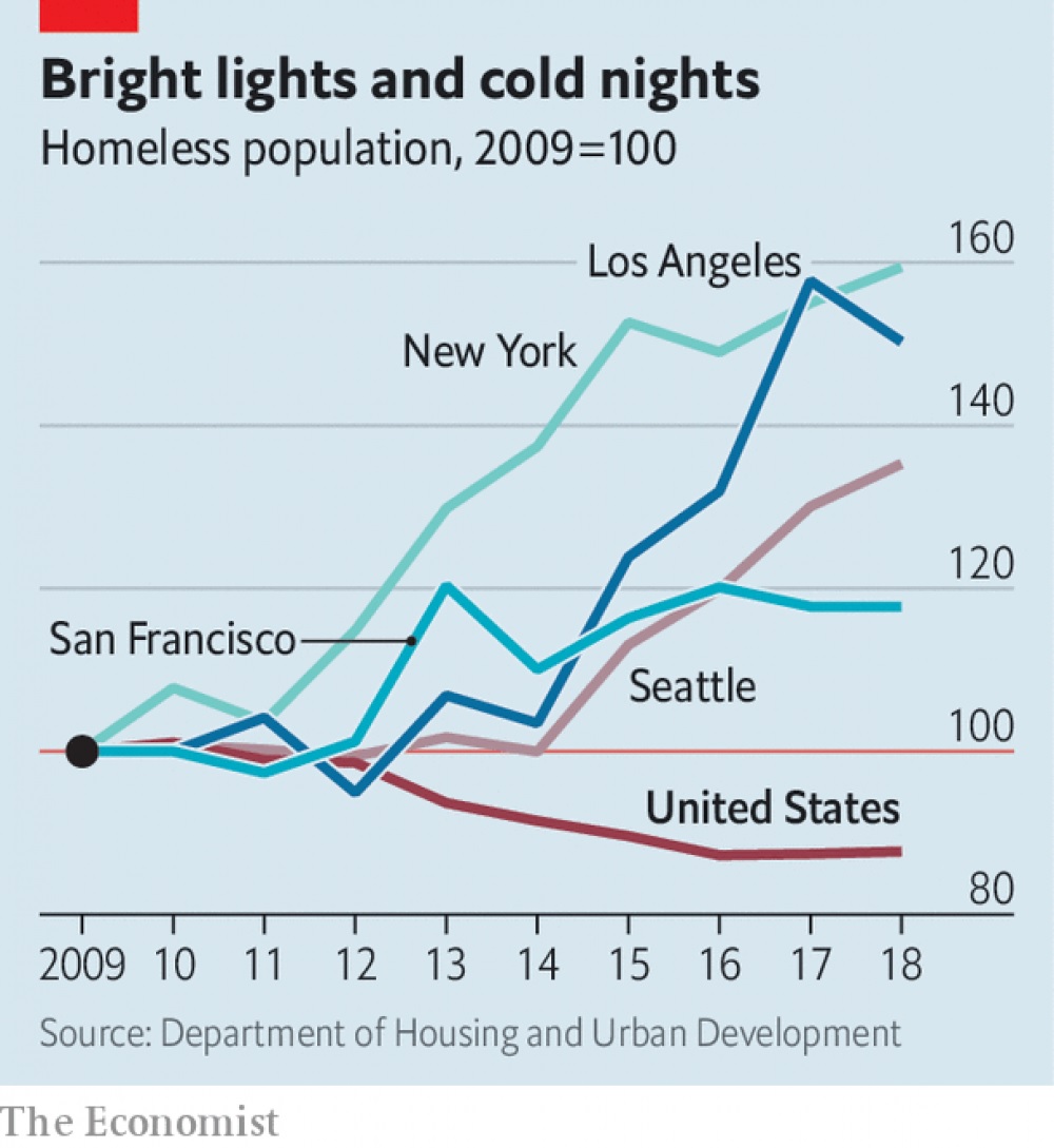 Despite significant public efforts—such as a surcharge on sales tax directed entirely towards homeless services and a $1.2bn bond issue to pay for affordable housing—the problem of homelessness is worsening in Los Angeles. It has emerged as the greatest liability for Eric Garcetti, the mayor, and may have hindered his ambitions to run for president. After spending hundreds of millions, the city was surprised to learn in July that the number of homeless people had increased by 12% from the previous year (city officials point out that this was less than in many other parts of California). Though it can be found everywhere, homelessness, unlike other social pathologies, is not a growing national problem. Rather it is an acute and worsening condition in America’s biggest, most successful cities.