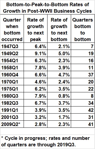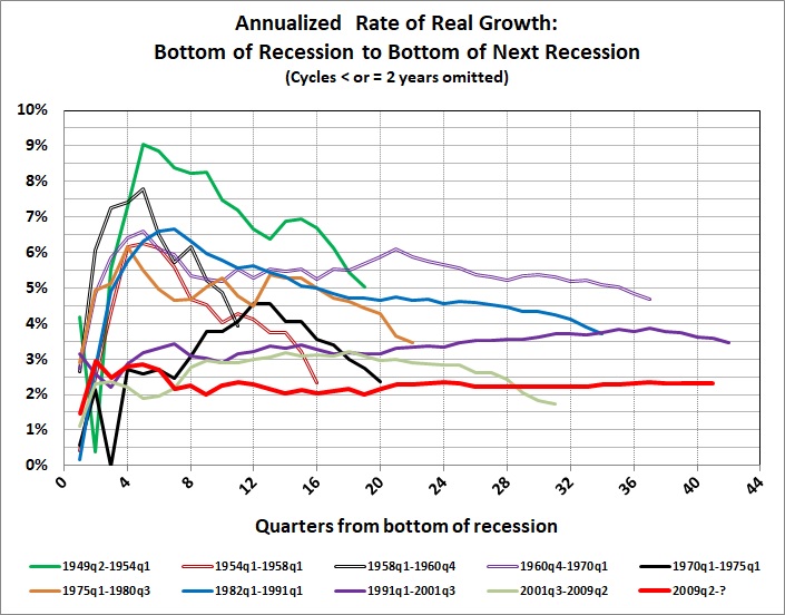 Note the large gap between the (low) peak growth rates experienced in recent cycles (purple, pale green, and red lines) and the (higher ones) experienced in earlier cycles. The peak for the current cycle (if you can call it a peak) occurred early (in the 5th quarter after the bottom of the Great Recession). Such a low peak so early in the cycle broke a pattern that had held since the end of World War II: