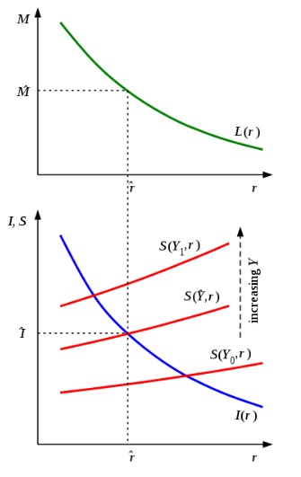 We can then analyse its effect from the diagram [reproduced below], in which we see that an increase in M̂ shifts r̂ to the left, pushing Î upwards and leading to an increase in total income (and employment) whose size depends on the gradients of all 3 demand functions. If we look at the change in income as a function of the upwards shift of the schedule of the marginal efficiency of capital (blue curve), we see that as the level of investment is increased by one unit, the income must adjust so that the level of saving (red curve) is one unit greater, and hence the increase in income must be 1/S'(Y) units, i.e. k units. This is the explanation of Keynes’s multiplier.
