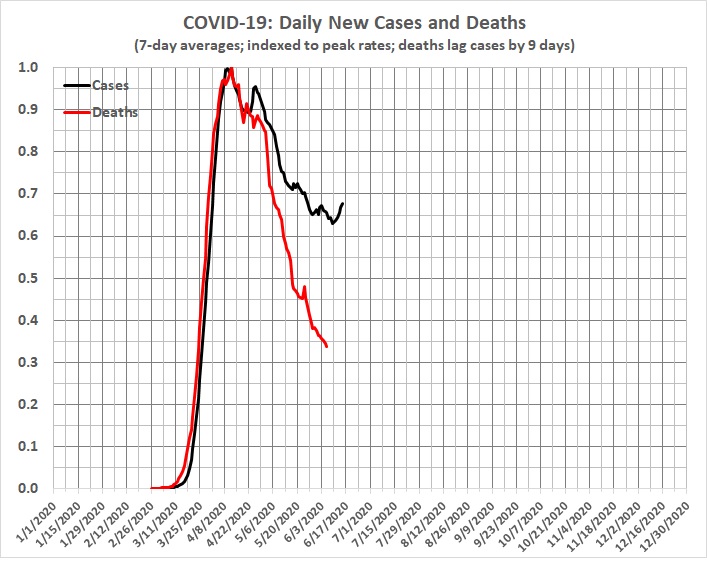 So when you hear about a “surge” in cases, do not assume that they are actually new cases. It’s just that new cases are being discovered because more tests are being conducted. The death toll, overstated as it is, is a better indicator of the state of affairs. And the death toll continues to drop.