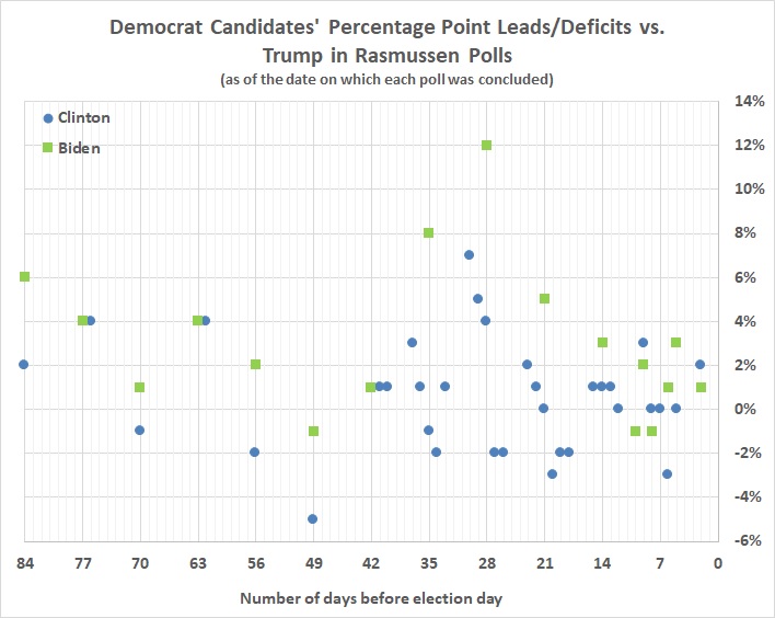 According to White House Watch at Rasmussen Reports, which nailed Clinton’s popular-vote edge four years ago, Biden is not out-performing Clinton: