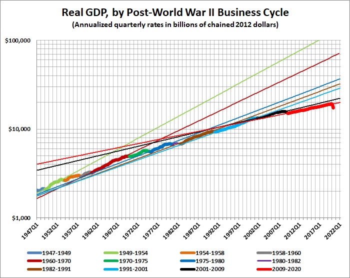 This graph highlights the declining rate of growth from business cycle to business cycle: