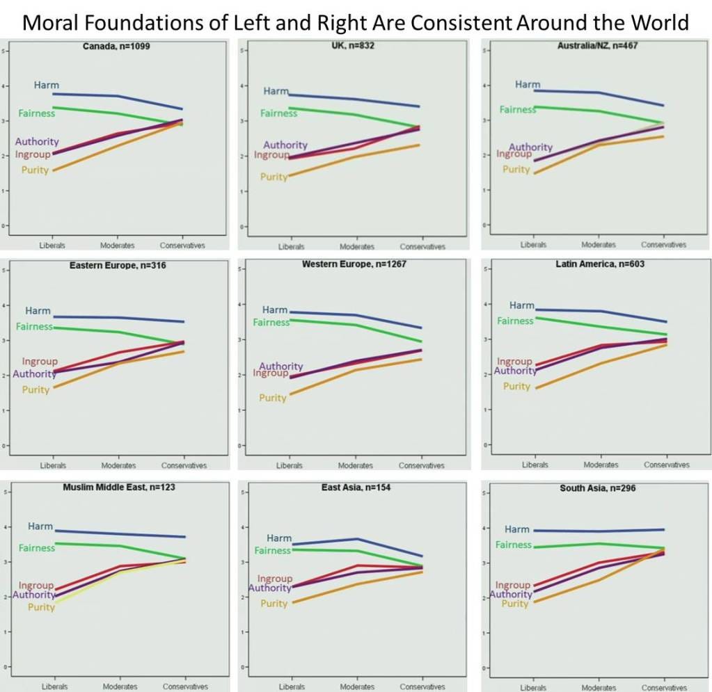 Haidt’s studies of moral foundations show that liberals tend to employ the individualizing foundations and, of those, mostly the care/harm foundation, whereas conservatives tend to use of all of them equally. There’s no conservative foundation that’s not also a liberal foundation but, for all practical purposes, half of the conservative foundations are unavailable to liberal social cognition. The graphic below comes from Haidt’s TED Talk [link added], and it shows that this pattern holds true in every culture studied on every continent, suggesting it is a human universal.