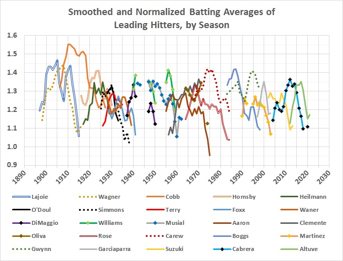 Figure 1 is a chronological comparison of the adjusted averages for each player who had the highest average at least once. The legend lists the players in the order in which they first attained the highest average.