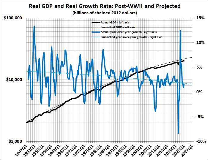 The exponential trend line indicates a constant-dollar (real) growth rate for the entire period of 0.77 percent quarterly, or 3.1 percent annually. The actual beginning-to-end annual growth rate is also 3.1 percent.
