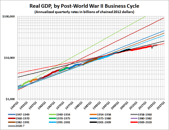 The trend lines, which reflect the rate of growth during each business cycle, are getting progressively “flatter”, that is, the rate of growth (with a few exceptions) is dropping from cycle to cycle.