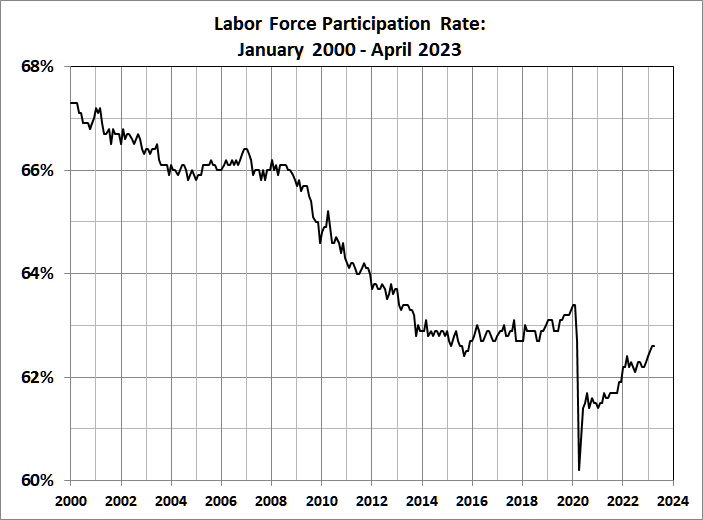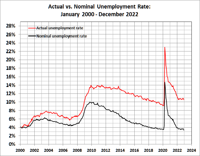 The government-reported unemployment rate of 3.4 percent for April 2023 is actually 10.1 percent. What the government doesn’t publicize is the labor-force participation rate, which has dropped from its January 2000 peak of 67.3 percent to 62.6 percent. (See this post for details of the calculation.) Here’s an up-to-date graph of nominal vs. actual unemployment rates: