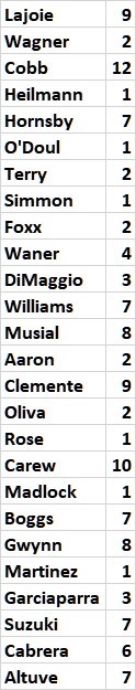 ** Here’s the list of batters I considered, with the spans of their major-league seasons in parentheses. The links lead to their pages at Baseball-Reference.com, from which I drew all the statistics used in this analysis: