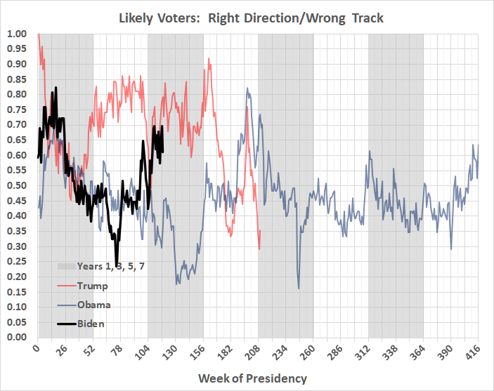 The mood of the voters polled during Trump’s term in office never reached the depths that it reached under Obama. Biden has challenged Obama’s lows but is now in Trump territory. How long will he stay there? See the discussion of presidential popularity, above.