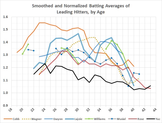 I computed for each player (list below**) a series of centered, three-year batting averages for three-year spans in which the player averaged at least 400 plate appearances a season. I used three-year averages to “smooth” year-to-year ups and downs and weed out one-year wonders.
