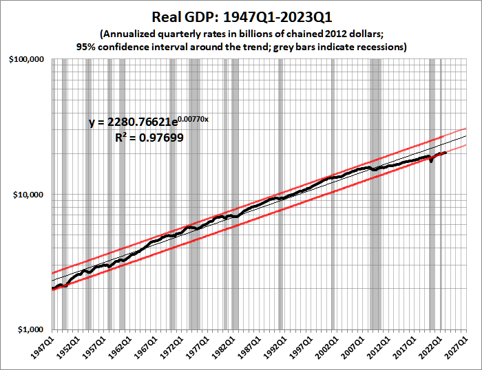 The red bands parallel to the trend line delineate the 95-percent (1.96 sigma) confidence interval around the trend. GDP has been below the confidence interval since the government-induced pandemic recession of 2020. Come to think of it, the back-to-back recessions of 1980-1982 and the Great Recession of 2008-2010 were also government-caused — the government in those cases being the Federal Reserve. The short recession of 2022, which may soon be followed by another one, can also be chalked up to the Fed.