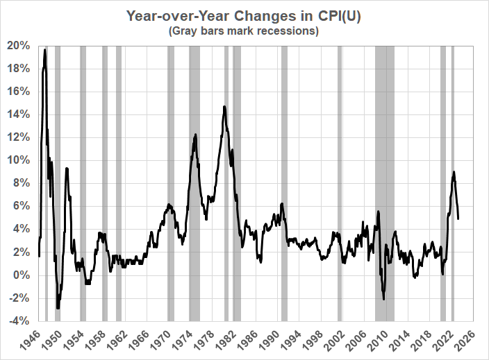 Today’s big headline in the leftist media is that inflation “cooled” to an annual rate of 4.9 percent. Big whoop! It “cooled” from 4.98 percent to 4.93 percent, a difference that is surely well within the margin of error for CPI statistics. Moreover, the four-quarter average of annualized monthly readings has been rising since December 2022 and is now 6.81 percent.
