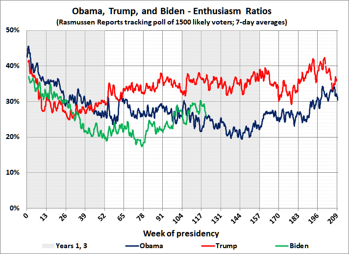 I have followed the Presidential Tracking Poll at Rasmussen Reports* since Obama was elected in 2008. The straightforward Approval Index (strongly approve minus strongly disapprove) doesn’t quite capture the way that likely voters assess a president’s performance. So I concocted an “enthusiasm ratio” — the number of likely voters who strongly approve as a percentage of the number of likely voters who venture an opinion one way or the other (thus omitting the voters who are non-committal). Here’s a comparison of the enthusiasm ratios for Obama (first term), Trump, and Biden (through 05/10/23):