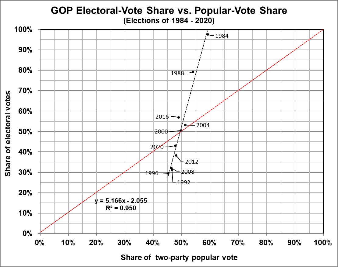 Look closely at the regression line in the graph and you will see that it doesn’t cross the dashed red line at the 50-50 mark. Rather, a GOP candidate (on average) can win 52.3 percent of the electoral votes with 49.9 percent of the nationwide popular vote. That’s because the smaller States — a majority of which lean GOP — are disproportionately represented in the electoral college. The upshot is that a candidate who wins the most States has an electoral-college advantage.