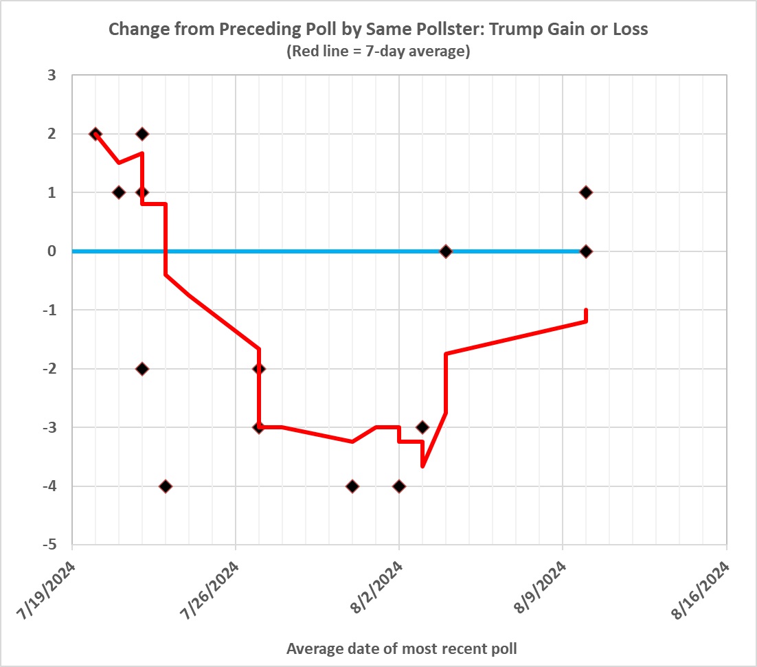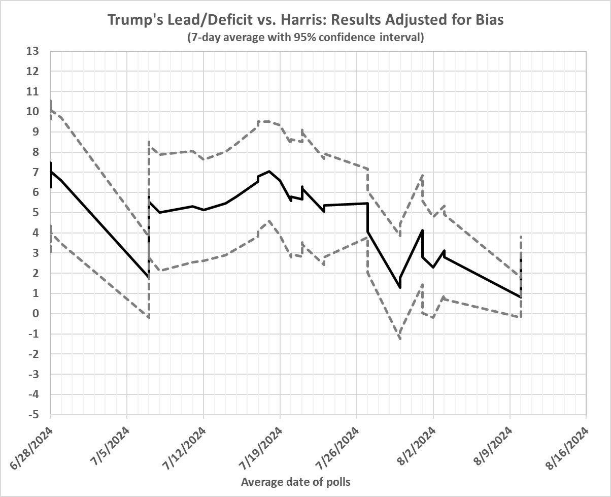 Given that Trump is again the GOP nominee, I see no reason to assume that the pro-Democrat bias this year is any smaller than it was in 2020. So I simply add 3.7 points to Trump’s 7-day polling averages to get a truer picture of Trump’s electoral appeal. Thus the values plotted in the preceding graph. (I am being generous to anti-Trump pollsters; the average anti-Trump bias in 2020, according to the American Association for Public Opinion Research, was 4.5 points for all.)