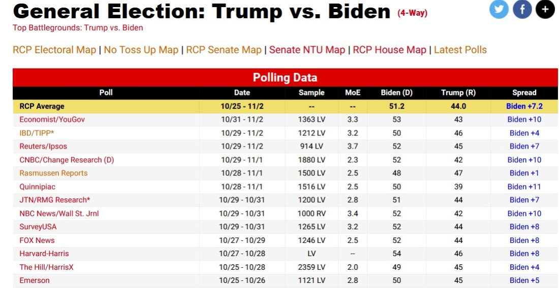 In yesterday’s post, I forecast a 285-253 electoral-vote victory for Biden. As of this morning afternoon, according to FoxNews, Biden has locked up 264 electoral votes and is leading in three States (Michigan, Nevada, and Wisconsin) whose electoral votes would give him a total of 270 — just enough for victory. It’s possible that Biden’s total could be higher, given the number of votes still to be counted in Georgia, North Carolina, and Pennsylvania, where Trump is currently ahead. And, of course, Biden could still lose any or all of the three undecided States where he is currently ahead. And both candidates can be expected to demand recounts, and recounts of recounts, and to seek judicial intervention all the way to the Supreme Court. But, whatever the outcome, I am pleased by the accuracy of my forecast. (Though I will be most displeased by the outcome if Biden proves to be the winner.)