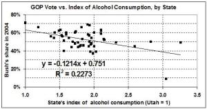 Sources: Share of popular vote, by State, derived from this page at Dave Leip’s Atlas of U.S. Presidential Elections. Index of alcohol consumption (total of beer, wine, and spirits) in 2005, by State, derived from “Per capita ethanol consumption for States, census regions, and the United States, 1970–2005” at the website of the National Institute on Alcohol Abuse and Alcoholism of the National Institutes of Health.