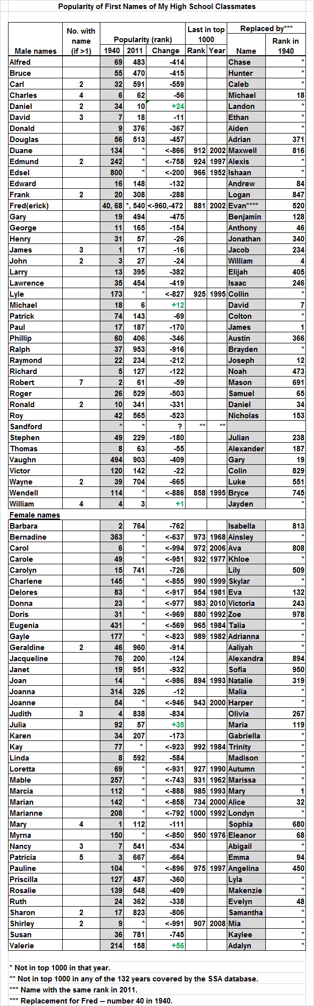 In previous posts about first names, I addressed names that had shifted from male to female, presidents’ surnames used as first names, the changing popularity of my grandparents’ first names, and the changing popularity of my high-school classmates’ first names.
