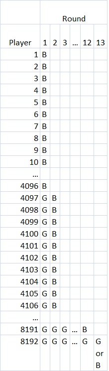 (The Gs drawn by players 8191 and 8192 in rounds 1-11 would have been matched, in each round, by other players who draw Bs in those rounds. Players 8191 and 8192, in this example, would be the only players left for round 12.)